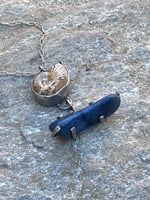 The ammonite rises above as a symbol of remembrance, while the blue stone below represents the deeper waters of inner knowing—always present, even when unseen.