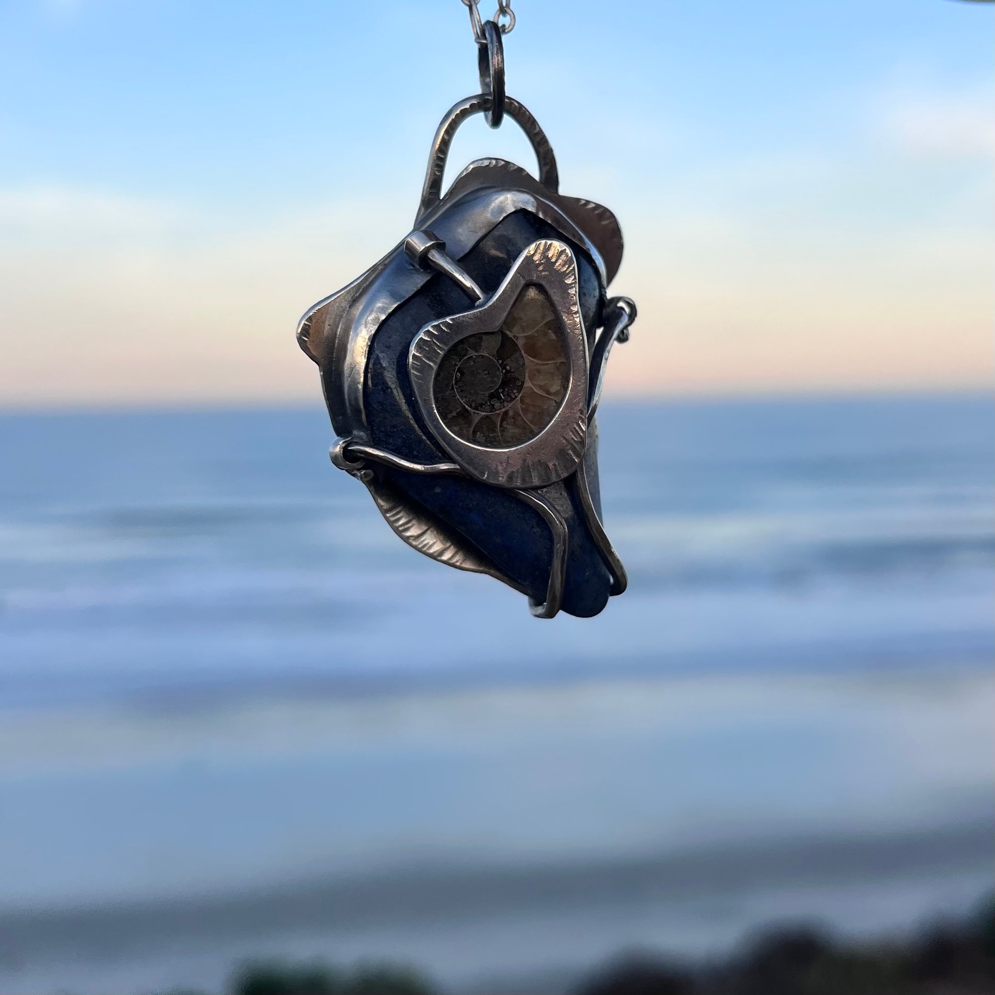 With the ammonite resting forward, this piece symbolizes what is ready to be seen, while the blue stone behind it represents the deeper waters from which that knowing emerges.