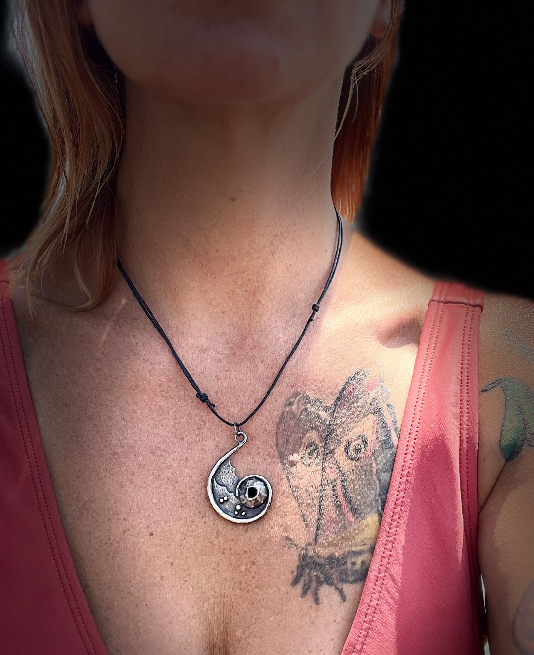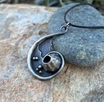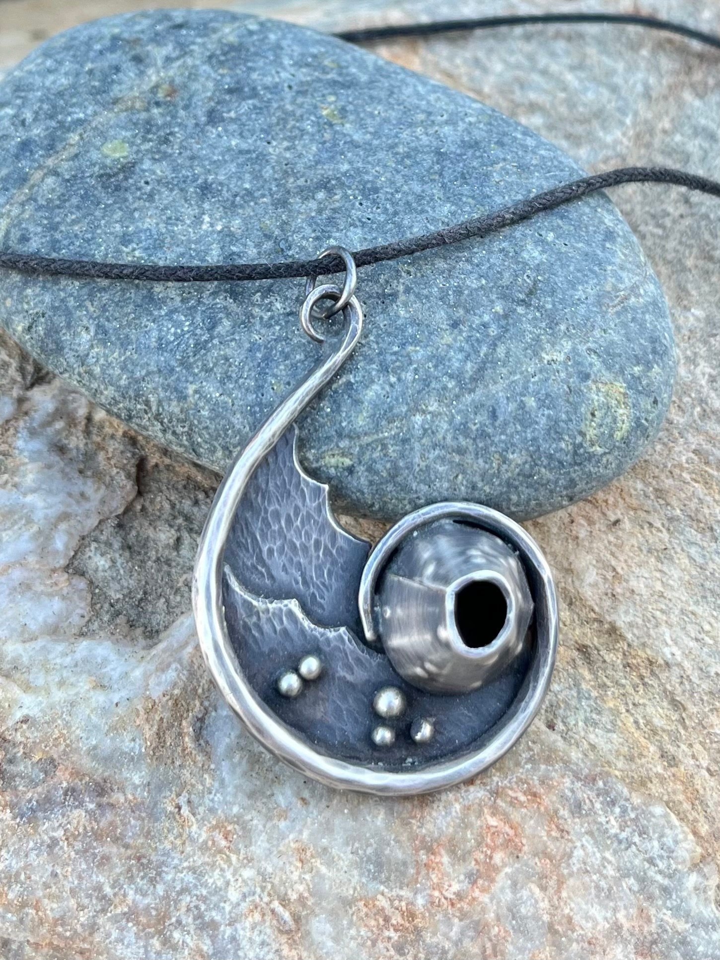 Barnacle wave pendant is handmade using metalsmithing techniques. It is forged to a long curved taper on each end to capture the ebb and flow of ocean waves. Silver is sawn and textured to form overlapping waves, and inside the spiral, a barnacle anchors in the center. Forged, textured and fabricated using sterling silver, this pendant is light-weight and comfortable. An adjustable cord accompanies the pendant.