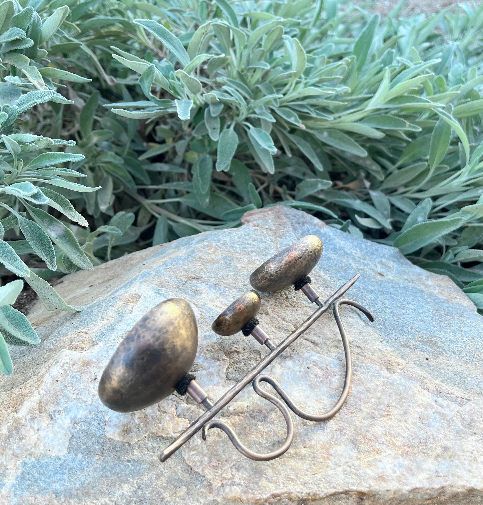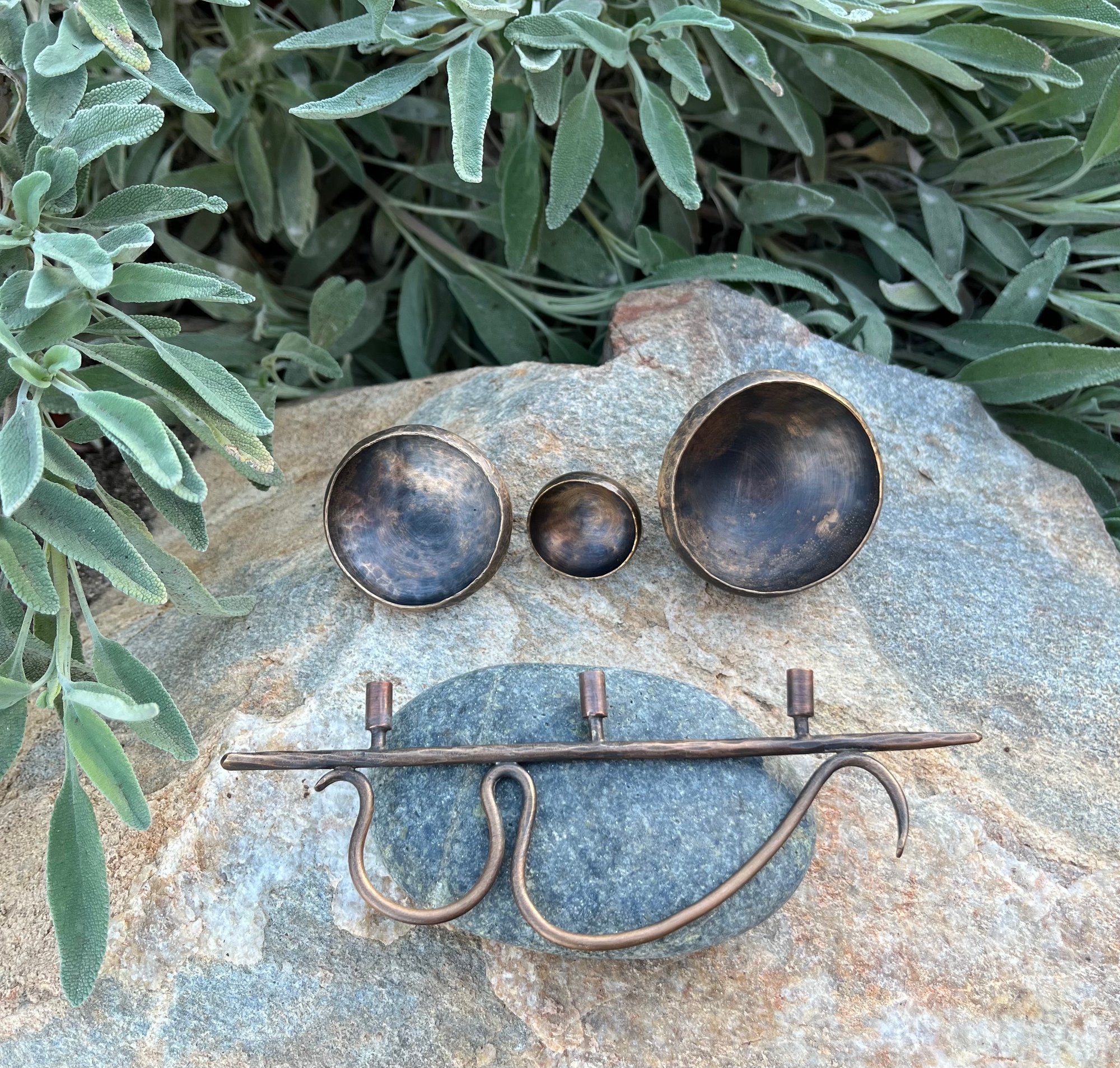 This Hum bowl ring is for when you want to have 3 different tonal vibrations at your fingertips. Completely handmade, leaving the hammer making each bowl unique. The design is set off the hand, so the bowls are able to hum while your hand is free. This ring is great for your own mindful practice, but also, if you are a yoga and/or meditation teacher, your hands remain free so you can assist/adjust your students. All jewelry is designed so that the hum bowls are interchangeable. This comes with 3 bowls. 2.5”, 1.75”, and 1.25”.